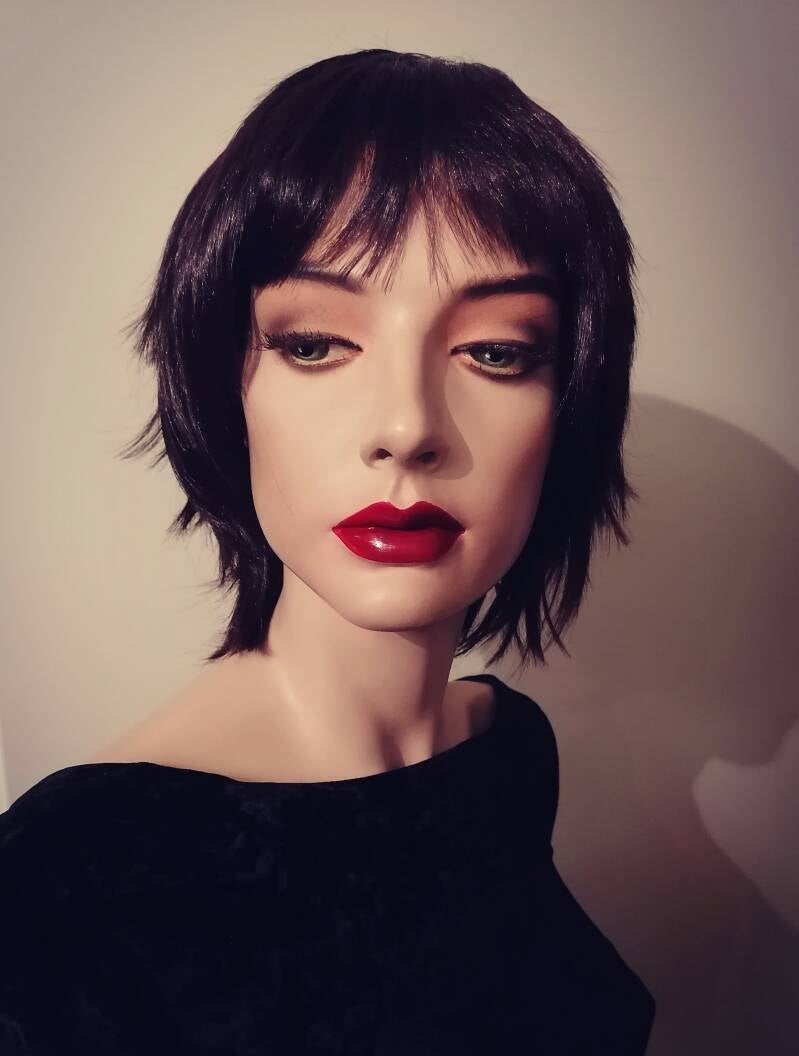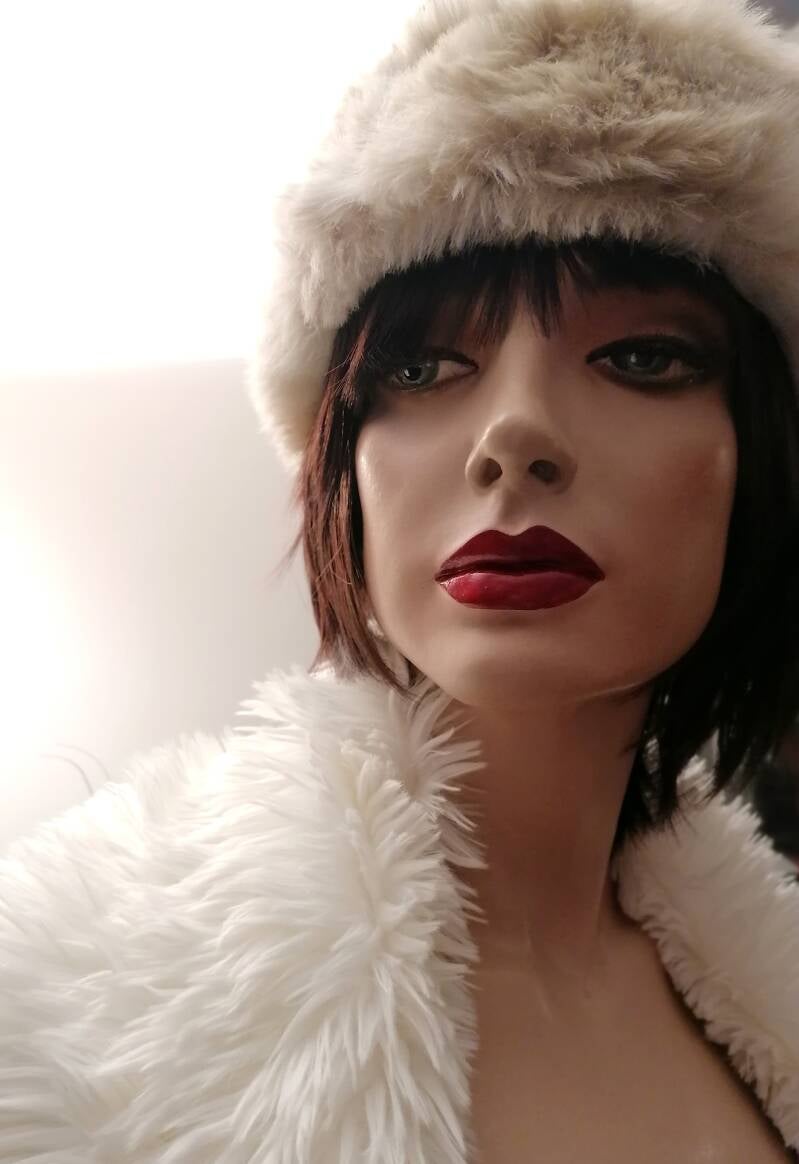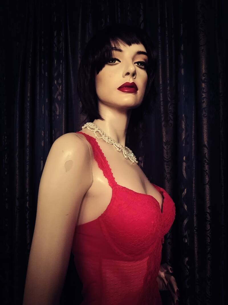 Tot op heden laat ik haar ongerestaureerd. Ze is structureel goed en had alleen wat touch up schilderwerk nodig. Ze showt vooral bijzondere dames kleding die ik vind. Een thema past ook niet bij haar. Ze draagt het liefst haar korte brunette pruik.