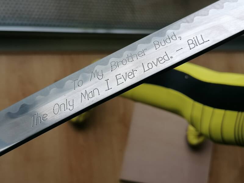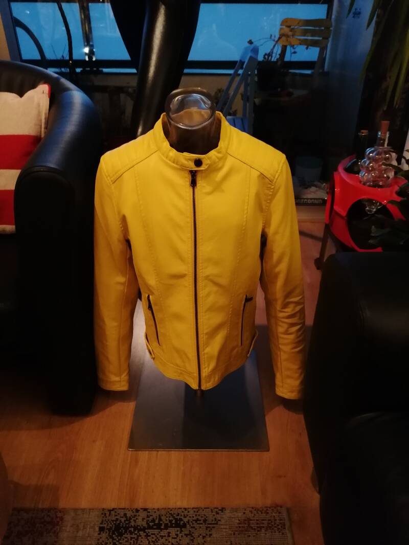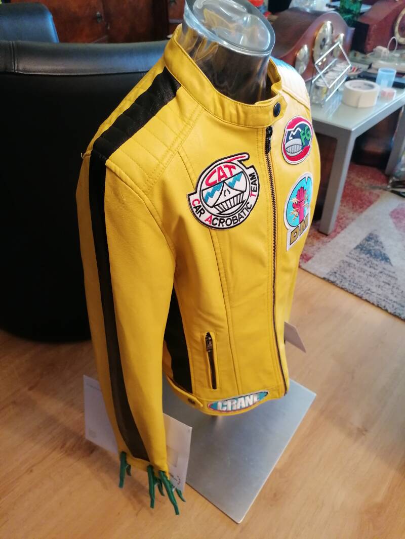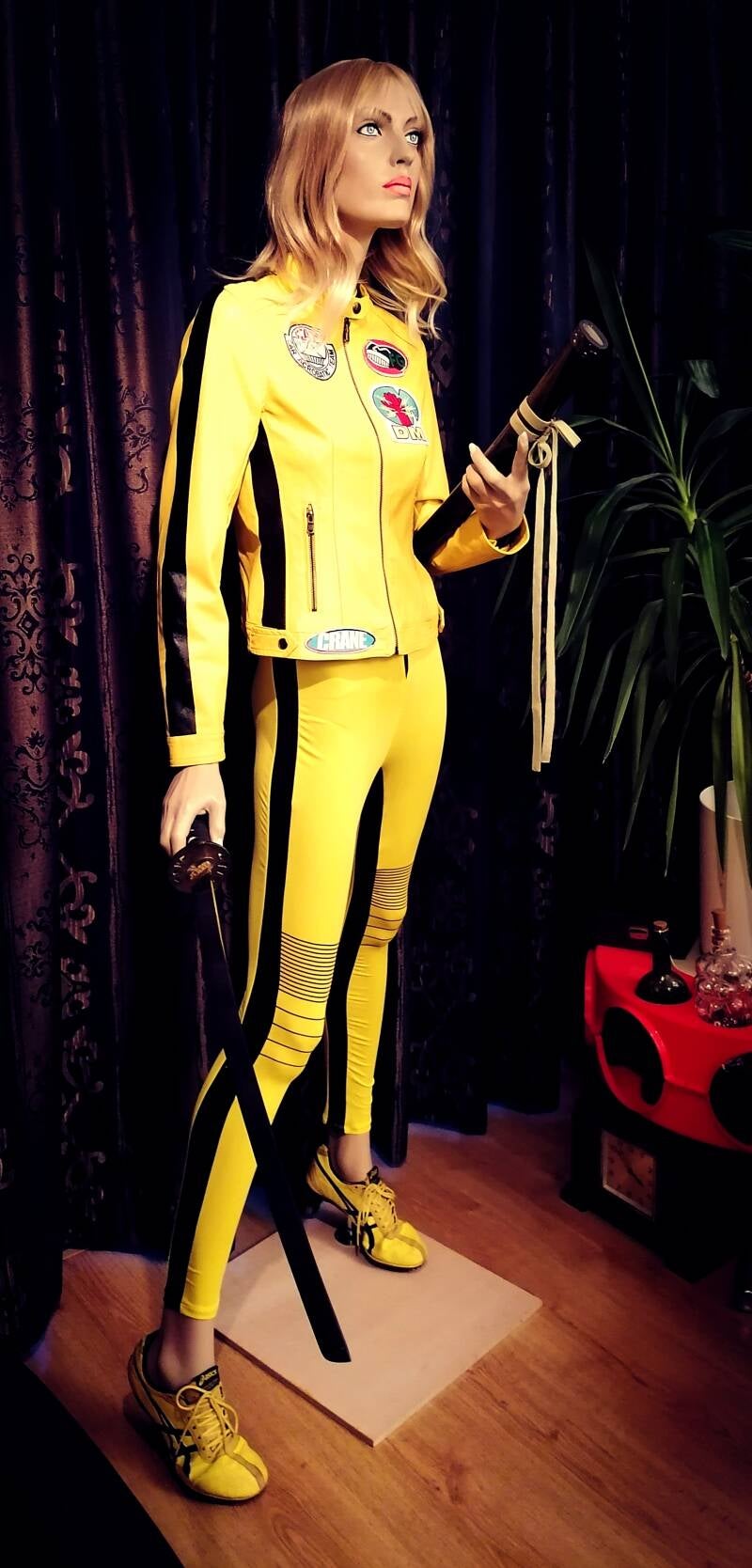 Ontdaan van haar originele make-up had zij een heel ander gezicht. Ik zag wat gelijkenissen met Uma Thurman.. althans met wat aanpassingen kon ze daarvoor doorgaan. Achteraf een echte hit wat haar pose leek niet veel af te wijken van Uma's filmposter. Ik zocht een bijpassende pruik, ik paste haar ogenkleur aan, zocht kleding in stijl, heb een geel jasje omgestyled tot haar motorjack met patches en leerverf geschildere zwarte striping. Ook vond ik Asics in de belangrijke geel met zwart thema en zelfs na enig tijd kwam er een Hattori Hanzo Samurai op mijn pad. Deze was een replica van 'Kill' Bill's broer Bud zijn samurai. In de film Heeft Uma hier nooit mee gevochten, maar het was zeer in de bedoelde stijl. Blij met het resultaat.