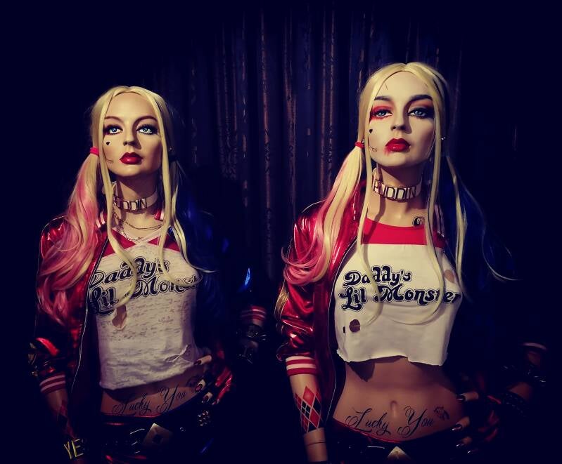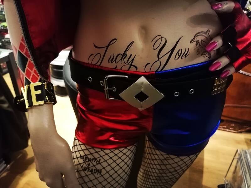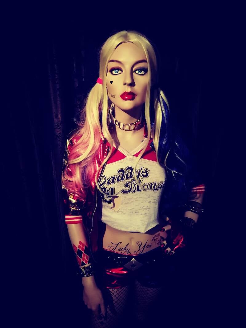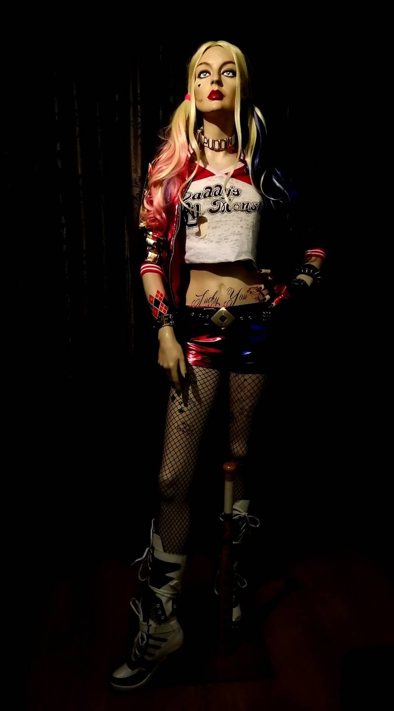 Het idee was geboren. Een lifesize mannequin moest er komen. Ik kocht in Deventer een etalagepop die haar dagen sleet in een klaslokaal als tekenobject. Ik zag haar gezichtuitdrukking en wist dat dit wel eens kon werken. Ietwat eigenwijs kijkende power. Na de overname kreeg ze een andere rol. Ze komt uit de #Adel Rootstein familie. Een merk dat zo goed als al haar mannequins baseerde op bestaande personen. Haar code is BB11. uit de Barbelle serie. Haar echte modelnaam bleek Roxanne.. Nu heet ze Harley Quinn. Volledige Tattooset, Oogkleur veranderd en film make-up maar toch met behoud van haar originele uitstraling en natuurlijk onmiskenbaar haar beste film outfit ooit uit Suicide Squad, vertolkt door de fenomenale Margot Robbie.
