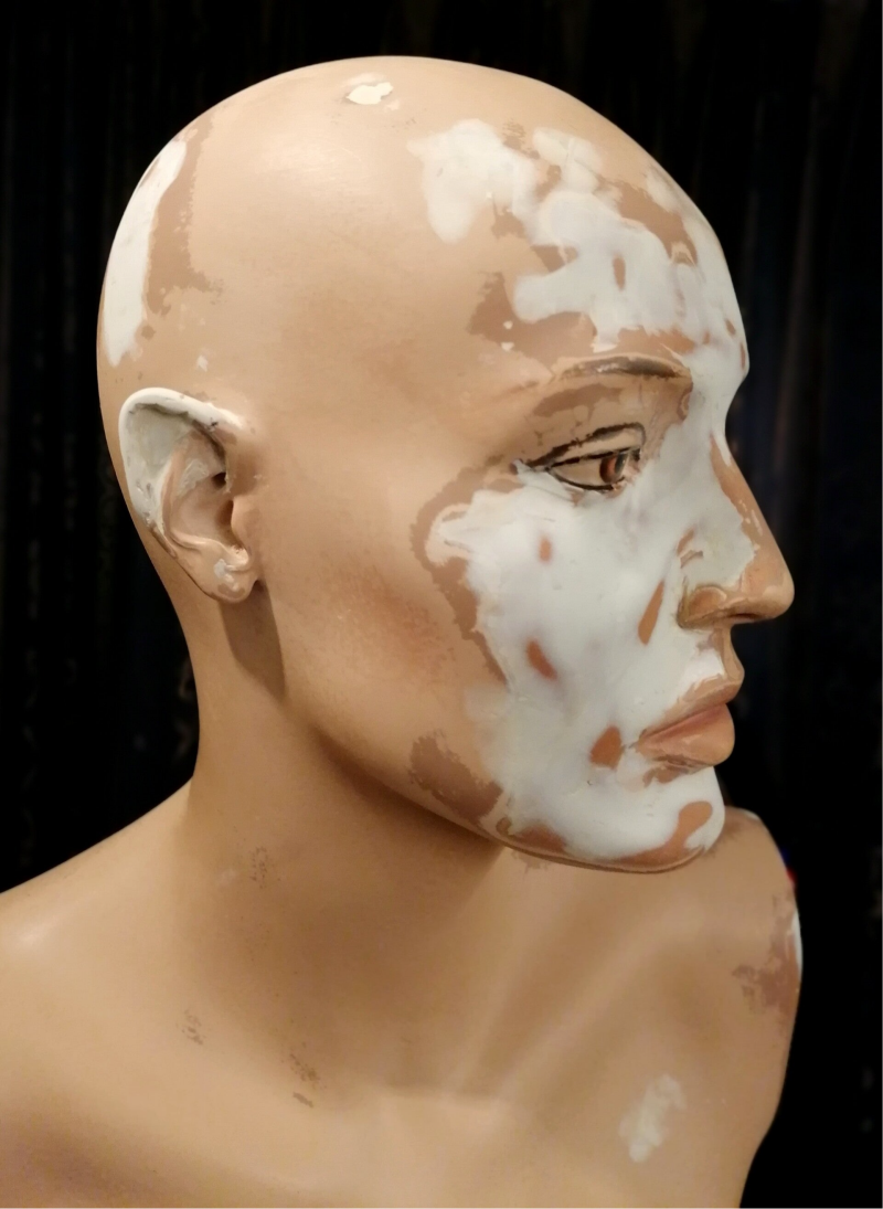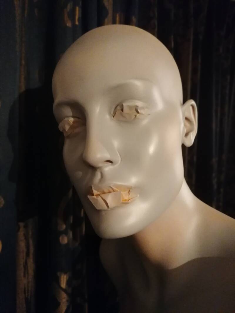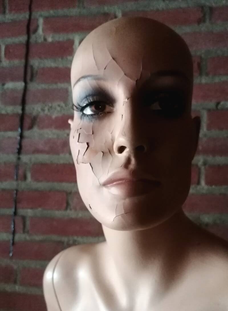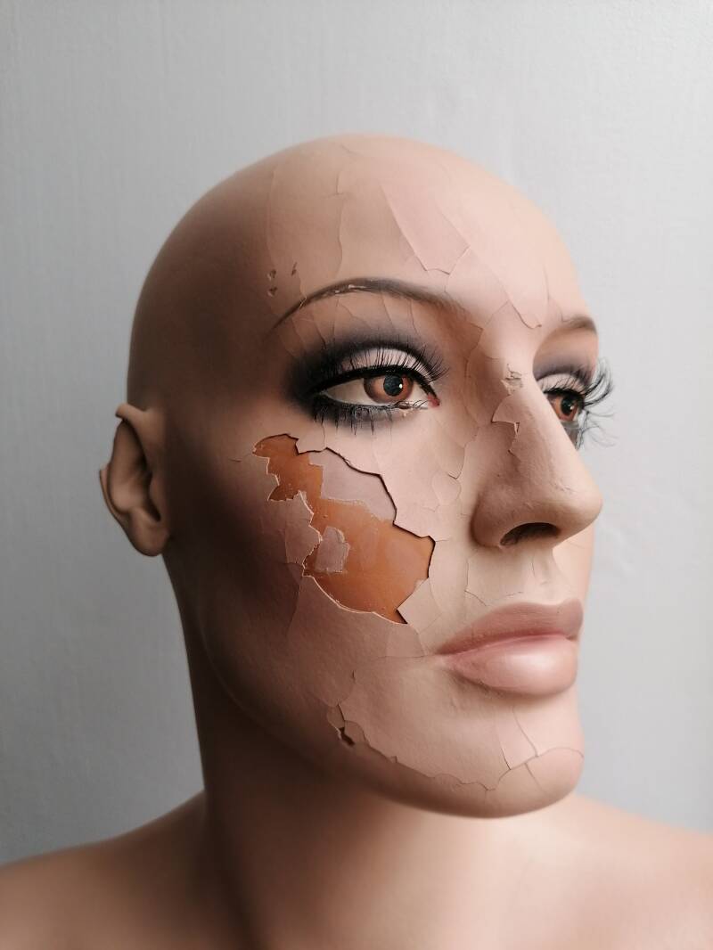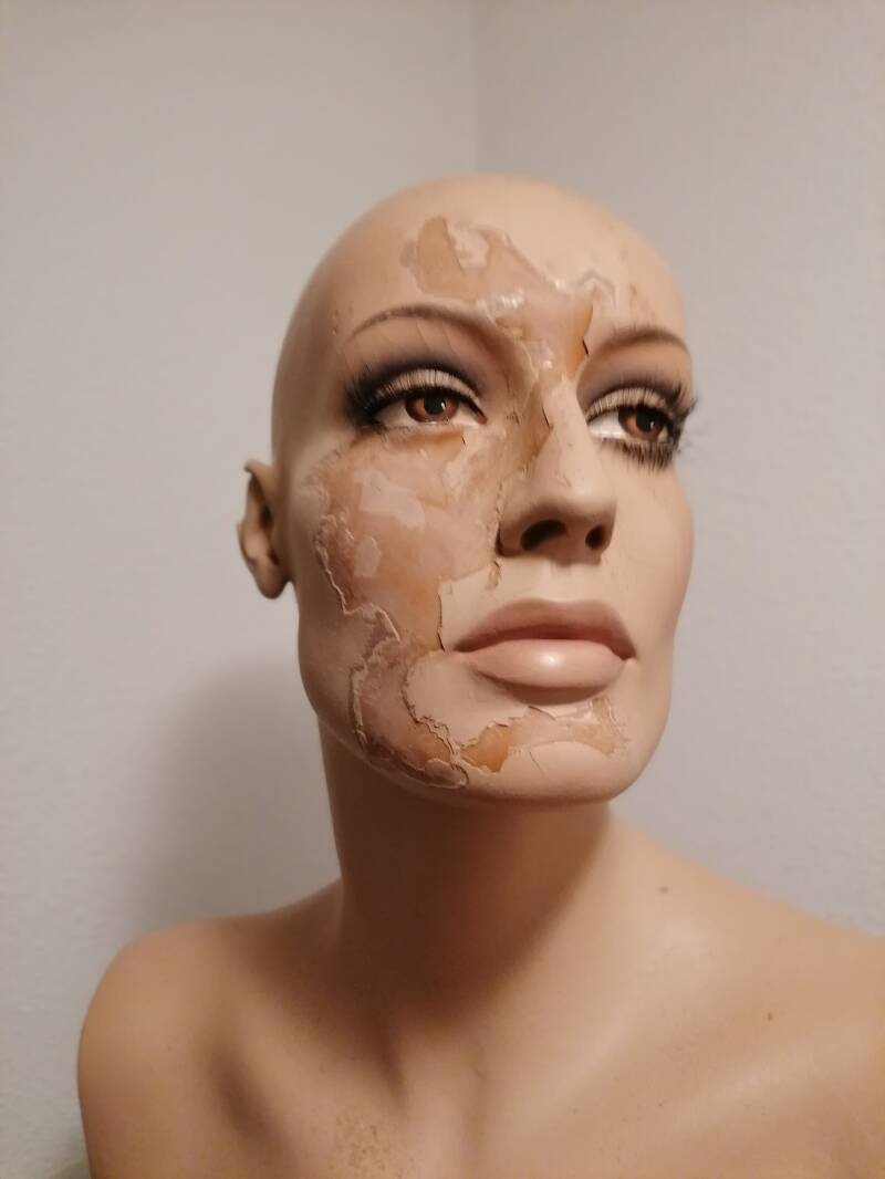 Vermoedelijk door opslag in te vochtige ruimte zijn de meeste gezichten gaan afbladeren.